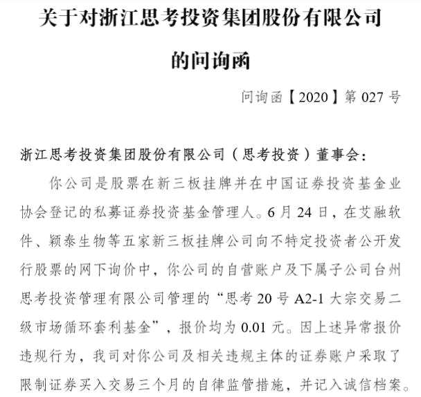 摘要: 在5只新三板新股網(wǎng)下詢價(jià)中做出“1分錢”的報(bào)價(jià),新三板公司思考投資因此受到“證券賬戶三個(gè)月禁止買入交易”的處罰,并在周末遭到全國(guó)股轉(zhuǎn)公司的緊急問詢。