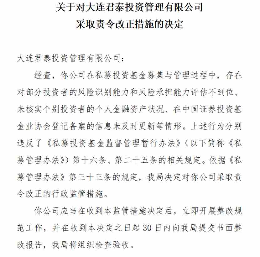 大連君泰被責(zé)令改正并開展整改規(guī)范