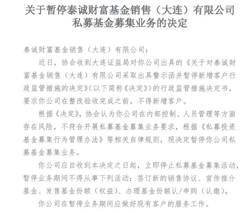 具體來看,8月3日,泰誠財(cái)富被中基協(xié)下發(fā)了處罰決定。在這份處罰決定中,中基協(xié)表示,收到了大連證監(jiān)局對(duì)其出具的《關(guān)于對(duì)泰誠財(cái)富基金銷售(大連)有限公司采取出具警示函并暫停新增客戶行政監(jiān)管措施的決定》,根據(jù)《決定》,中基協(xié)也認(rèn)為泰誠財(cái)富在內(nèi)部控制、人員管理等方面存在風(fēng)險(xiǎn),不符合開展私募基金募集業(yè)務(wù)的要求。
