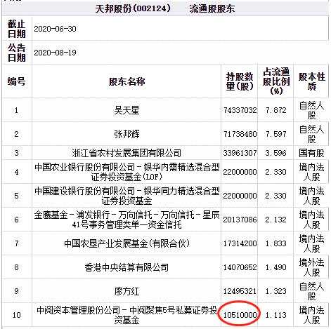 截至今年二季度末,中閱資本管理股份公司旗下的中閱聚焦5號私募證券投資基金持有天邦股份1051.00萬股,占流通股比例為1.113%,是天邦股份第十大流通股東。