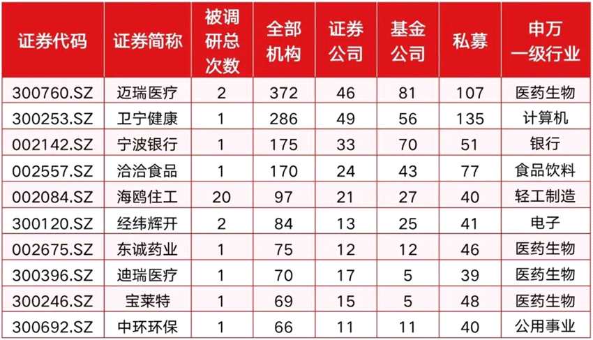 另據(jù)《紅周刊》記者梳理顯示,除了偏好醫(yī)藥、電子、計(jì)算機(jī),三者又各有不同。如私募更偏重醫(yī)藥股,觀察私募的前十大調(diào)研股中,4只為醫(yī)藥生物公司,如邁瑞醫(yī)療、寶萊特(300246)、東誠藥業(yè)(002675)、迪瑞醫(yī)療(300396)。觀察基金公司的前十大調(diào)研股,3只為計(jì)算機(jī)標(biāo)的,如衛(wèi)寧健康、德賽西威、美亞柏科(300188),兩只為電子股,如卓勝微、【經(jīng)緯輝開(300120)、股吧】(300120),基金公司則更偏重科技。
