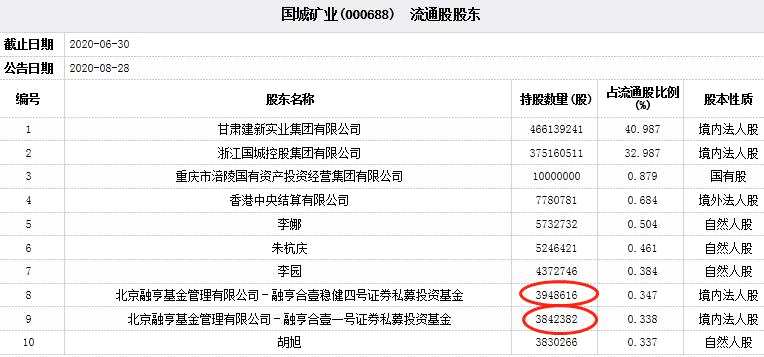 截至今年二季度末,北京融亨基金管理有限公司旗下的融亨合壹穩(wěn)健四號證券私募投資基金、融亨合壹一號證券私募投資基金分別持有國城礦業(yè)394.86萬股、384.24萬股,占流通股比例分別為0.347%、0.338%,分別位列國城礦業(yè)第八、第九大流通股股東。