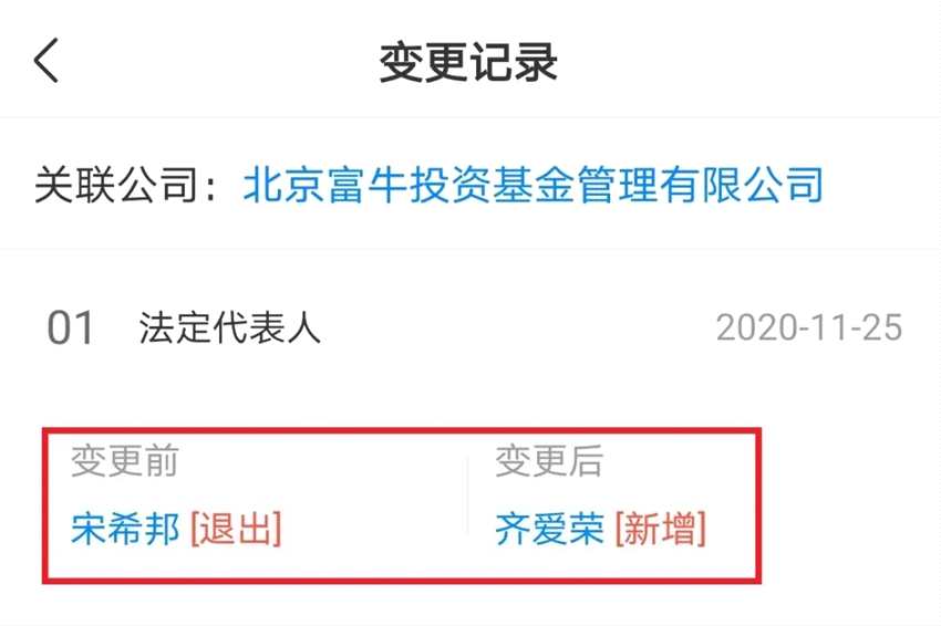 值得注意的是,天眼查信息顯示,北京富牛投資基金管理有限公司在11月末剛剛更換了其法定代表人,法定代表人由宋希邦更改為齊愛榮。
