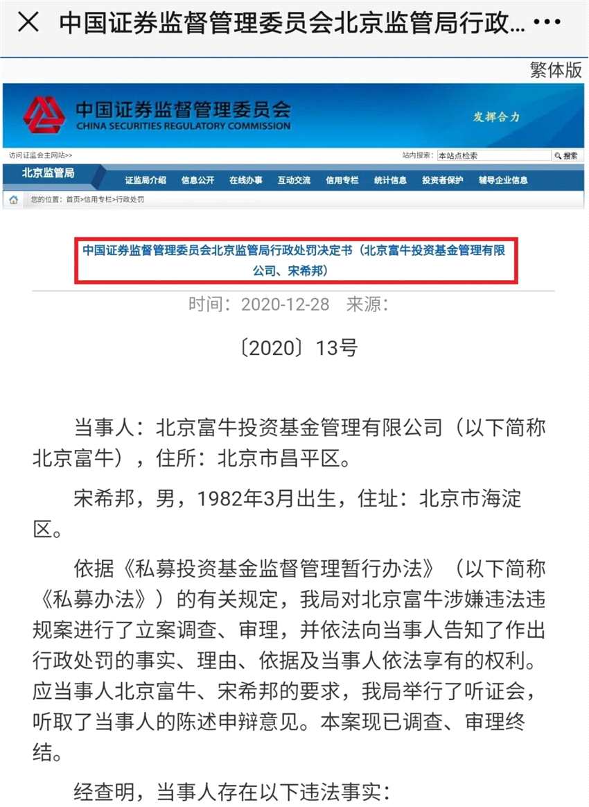 近日,北京證監(jiān)局責(zé)令北京富牛投資基金管理有限公司對(duì)其違法行為進(jìn)行改正,給予警告并處罰,北京富牛的直接負(fù)責(zé)主管人員宋希邦也一并領(lǐng)了罰單。