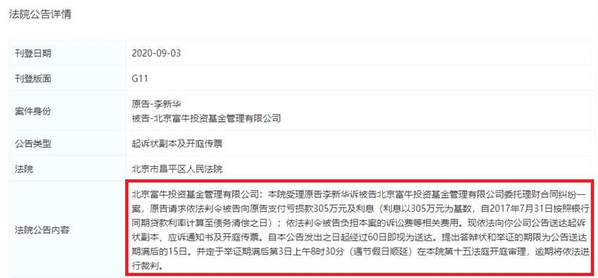 今年9月,北京富牛也遭到了投資者的起訴,來(lái)自北京市昌平區(qū)人民法院的起訴狀副本及開庭傳票顯示,北京市昌平區(qū)人民法院受理原告李新華訴被告北京富牛投資基金管理有限公司委托理財(cái)合同糾紛一案,原告請(qǐng)求依法判令被告向原告支付虧損款305萬(wàn)元及利息(利息以305萬(wàn)元為基數(shù),自2017年7月31日按照銀行同期貸款利率計(jì)算至債務(wù)清償之日)。