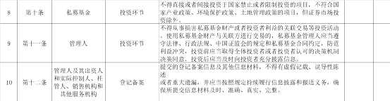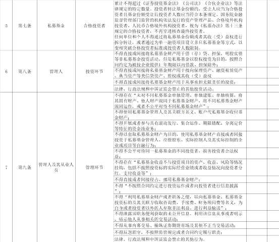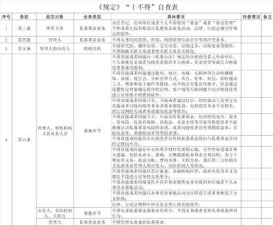 然后還有《規(guī)定》“十不得”自查表,包含10部分內(nèi)容,從私募基金業(yè)務(wù)、股權(quán)結(jié)構(gòu)、募集環(huán)節(jié)、合格投資者、投資環(huán)節(jié)、管理環(huán)節(jié)、登記備案等。具體大家可以對(duì)照看看自查表。