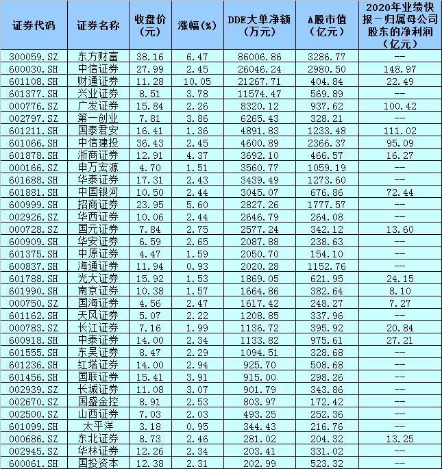 表:2月9日大單資金凈流入的券商股一覽