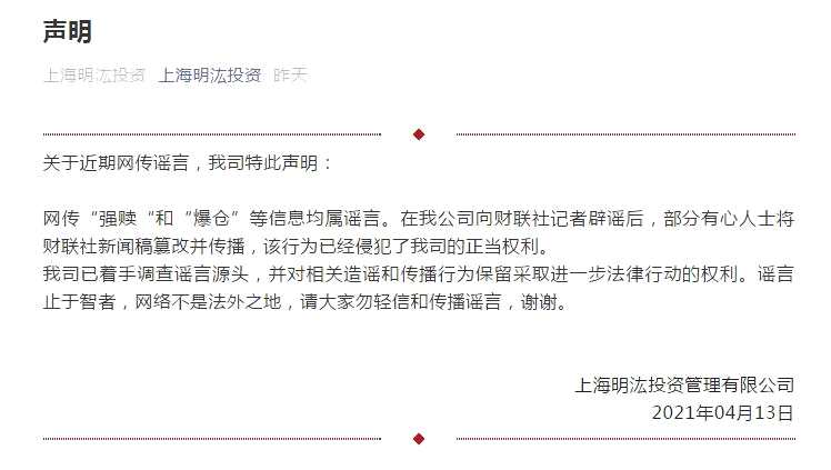明汯投資稱,在公司向媒體辟謠后,部分有心人士將新聞稿篡改并傳播,該行為已經(jīng)侵犯公司的正當(dāng)權(quán)利。公司已著手調(diào)查謠言源頭,并對相關(guān)造謠和傳播行為保留采取進(jìn)一步法律行動(dòng)的權(quán)利。明汯投資表示,謠言止于智者,網(wǎng)絡(luò)不是法外之地,請大家勿輕信和傳播謠言。