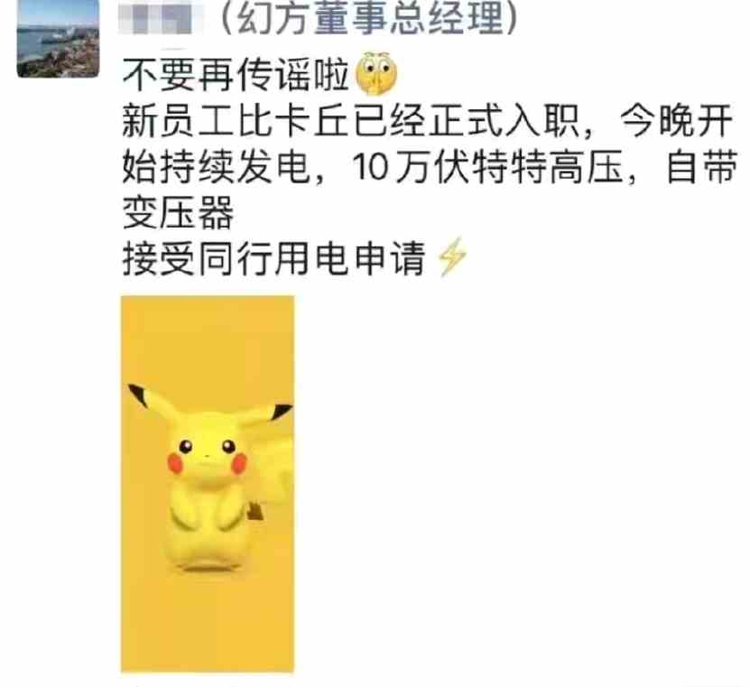 該公司一高管也在朋友圈辟謠,希望大家“不要再傳謠”,同時戲稱“新員工比卡丘已正式入職,今晚開始持續(xù)發(fā)電,10萬伏特特高壓,自帶變壓器,接受同行用電申請”。