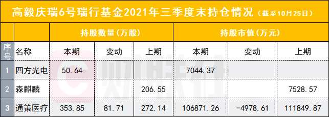 根據(jù)最新數(shù)據(jù),三季度,高毅資產(chǎn)董事長邱國鷺順利捕獲一只今年以來暴漲的股票——平高電氣(600312,股吧);明星基金經(jīng)理馮柳堅(jiān)守??低?002415,股吧)的同時(shí)新進(jìn)華貿(mào)物流(603128,股吧),并減持西部超導(dǎo)(688122,股吧)500萬股;孫慶瑞在退出森麒麟的前十大流通股東名單、新進(jìn)為中小市值股——四方光電第四大流通股東的同時(shí),還增持了通策醫(yī)療(600763,股吧)81.71萬股,期末持股市值達(dá)到10.69億元;另外,吳任昊管理的基金新進(jìn)為萬年青(000789,股吧)第五大流通股東,并退出此前被其青睞的化工企業(yè)——【山東赫達(dá)(002810)、股吧】(002810,股吧)前十大流通股東名單,他此前曾多個(gè)季度增持該股。