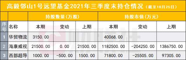 根據(jù)最新披露的數(shù)據(jù),明星基金經(jīng)理馮柳管理的產(chǎn)品——高毅鄰山1號(hào)遠(yuǎn)望基金,在今年三季度依然堅(jiān)守著海康威視2.15億股不變,期末持股市值為118.25億元。同期,他新進(jìn)為華貿(mào)物流第六大流通股東,最新持股數(shù)量為3150萬股,期末持股市值高達(dá)4億元。