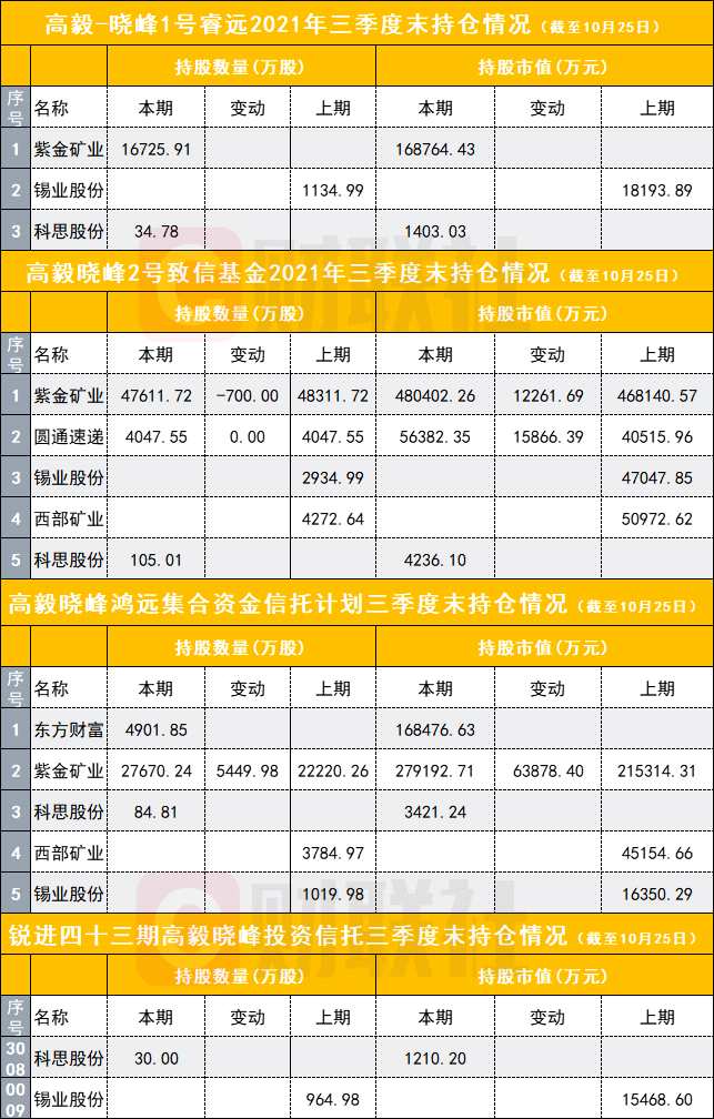 根據(jù)公告,三季度末,他掌舵的高毅-曉峰1號(hào)睿遠(yuǎn)、高毅曉峰2號(hào)致信基金、高毅曉峰鴻遠(yuǎn)集合資金信托計(jì)劃,這三只基金均現(xiàn)身紫金礦業(yè)前十大流通股東,持股數(shù)量均合計(jì)達(dá)到9.2億股,期末持股市值高達(dá)92.84億元,較二季度末持股數(shù)量增加2.15億股。