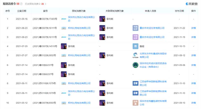 尤其是今年以來,比克動力與李向前還多次被“限制消費”,最近一份限制消費令的下達的時間是2021年11月22日,申請人是重慶市中潤化學有限公司。