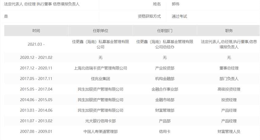 2021年的春節(jié)過后,在金融職場連續(xù)奔跑14年的郭偉與合伙人一起成立了佳更鑫(海南)私募基金管理有限公司,他擔任法定代表人、總經(jīng)理,其機構(gòu)類型為:私募股權(quán)、創(chuàng)業(yè)投資基金管理人。