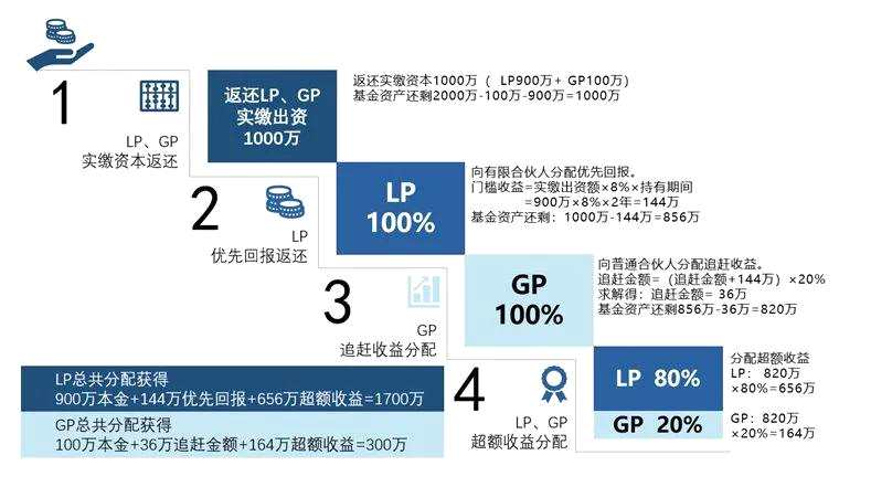 最終,LP分配得到:900萬本金+144萬優(yōu)先回報(bào)+656萬超額收益=1700萬,GP分配得到:100萬本金+36萬追趕金額+164萬超額收益=300萬。