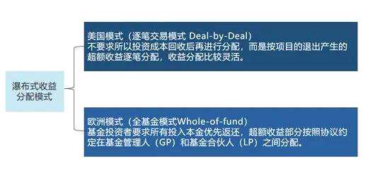 瀑布式收益分配模式主要有兩種,一種是美國模式(Deal-by-Deal),這類模式的收益分配比較靈活,不要求所有投資成本回收后再進(jìn)行分配,而是按項(xiàng)目的退出產(chǎn)生的超額收益逐筆分配;另一種是歐洲模式(Whole-of-fund),這類模式基金投資者要求所有投入本金優(yōu)先返還,超額收益部分按照協(xié)議約定在基金管理人(GP)和基金合伙人(LP)之間分配。