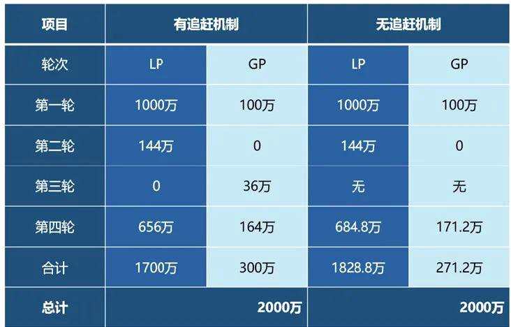 下表對(duì)比了是否設(shè)置追趕機(jī)制對(duì)最終LP與GP收益分配的影響: