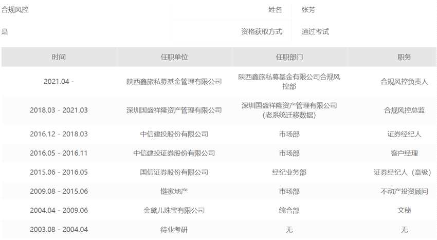 2021年4月,帶著在深圳國(guó)盛祥隆資產(chǎn)管理有限公司三年的合規(guī)風(fēng)控總監(jiān)的履歷,張芳敲開(kāi)了陜西鑫旅私募基金管理有限公司的大門,并成為這家私募基金的合規(guī)風(fēng)控負(fù)責(zé)人。