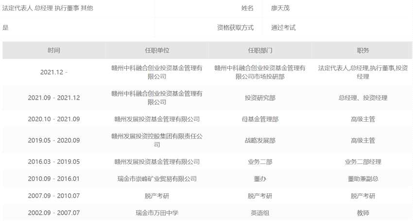 在贛州發(fā)展投資的五年,廖天茂完成了從一名實(shí)業(yè)公司到金融投資公司的轉(zhuǎn)型,“金融+實(shí)業(yè)”的厚積薄發(fā),讓他無(wú)縫銜接地被中科融合科技發(fā)展有限公司看上,并被委任他成為其控股的私募基金總經(jīng)理。