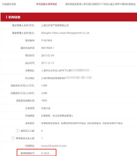 基金業(yè)協(xié)會信息顯示,上海億舟資產(chǎn)管理有限公司成立于2013年12月,注冊資本2000萬,2015年2月完成備案登記,機構(gòu)類型是私募股權(quán)、創(chuàng)業(yè)投資基金管理人。目前管理規(guī)模區(qū)間在0-5億元。協(xié)會提示信息也顯示,億舟資產(chǎn)存在逾期未清算基金。