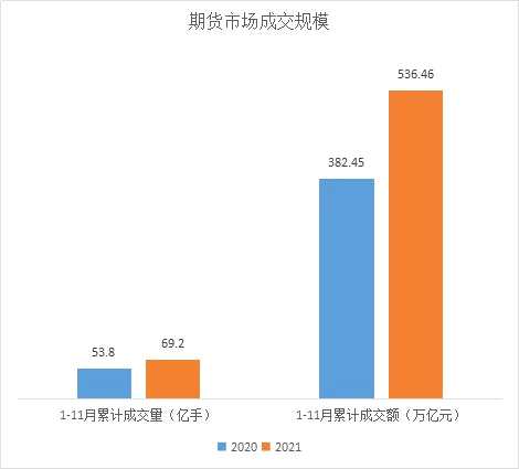 并且,不同于股市的流動性,2021年期貨市場資金總量已突破1.2萬億元, 比2020年末增長44.5%。11月累計成交69.19億手,累計成交金額536.46萬億元,同比分別增長28.61%和40.27% 。
