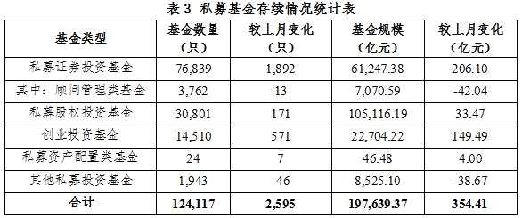 截至2021年12月末,存續(xù)私募基金124,117只,存續(xù)基金規(guī)模19.76萬億元,較上月增加354.41億元,環(huán)比增長0.18%。其中,存續(xù)私募證券投資基金76,839只,存續(xù)規(guī)模6.12萬億元,環(huán)比增長0.34%;存續(xù)私募股權投資基金30,801只,存續(xù)規(guī)模10.51萬億元,環(huán)比增長0.03%;存續(xù)創(chuàng)業(yè)投資基金14,510只,存續(xù)規(guī)模2.27萬億元,環(huán)比增長0.66%。