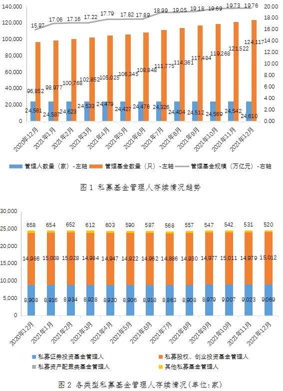 截至2021年12月末,存續(xù)私募基金管理人24,610家,較上月增加68家,環(huán)比增長0.28%;管理基金數(shù)量[1]124,117只,較上月增加2,595只,環(huán)比增長2.14%;管理基金規(guī)模[2]19.76萬億元,較上月增加354.41億元,環(huán)比增長0.18%。其中,私募證券投資基金管理人9,069家,較上月增加46家,環(huán)比增長0.51%;私募股權、創(chuàng)業(yè)投資基金管理人15,012家,較上月增加33家,環(huán)比增長0.22%;私募資產(chǎn)配置類基金管理人9家,與上月持平;其他私募投資基金管理人520家,較上月減少11家,環(huán)比下降2.07%。