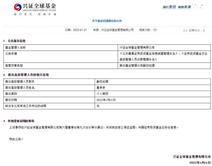 1月21日,興證全球基金發(fā)布《關(guān)于副總經(jīng)理離任的公告》,公司副總經(jīng)理董承非因”個(gè)人原因”離任,離任日期為2022年1月21日。
