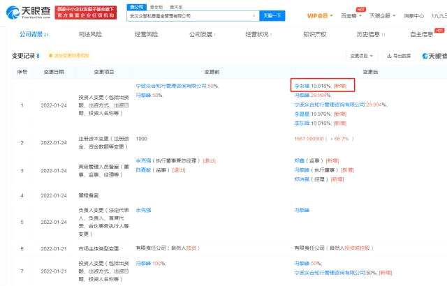 天眼查APP顯示,近日,武漢眾擎私募基金管理有限公司發(fā)生工商變更,新增股東李書福、李星星、李東輝,法定代表人由余克強變更為馮擎峰,同時企業(yè)注冊資本增至1667萬。