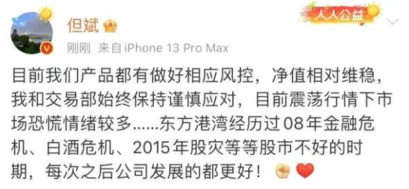 對此,但斌在其微博中回應稱:“目前我們產品都有做好相應風控,凈值相對維穩(wěn),我和交易部始終保持謹慎應對,目前震蕩行情下市場恐慌情緒較多……東方港灣經歷過2008年金融危機、白酒危機、2015年股災等等股市不好的時期,每次之后公司發(fā)展得都更好!”