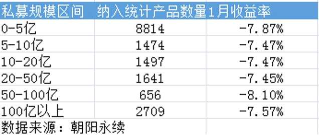 數(shù)據(jù)顯示,今年1月,國內(nèi)所有規(guī)模組別的股票策略私募機構(gòu),平均收益率均低于-7%。其中,百億級私募組別1月平均虧損7.57%,在六大規(guī)模組別中位列第四。
