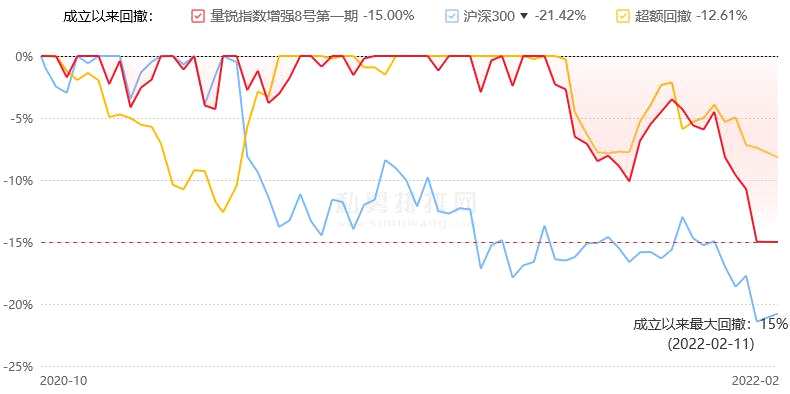 量銳指數(shù)增強(qiáng)8號(hào)第一期以-11.00%成為該公司的跌幅冠軍,該基金成立于2020年10月13日,截至2022年2月11日,其累計(jì)單位凈值為1.1284元,自成立以來的最大歷史回撤為15%,超額回撤-12.61%。