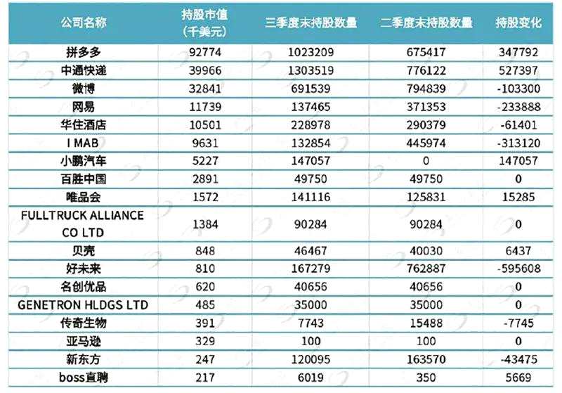 其中,高毅資產(chǎn)美股持倉中的第一大重倉股是拼多多,持有87.12萬股,相較去年三季度末減持了15.2萬股;第二大重倉股則是中通快遞,持有153.47萬股,持股市值達4331萬美元,相較去年三季度末增持了23.12萬股;第三大重倉股是貝殼,持有128.69萬股,持股市值為2589.3萬美元,較去年三季度末大舉增持了124.04萬股。