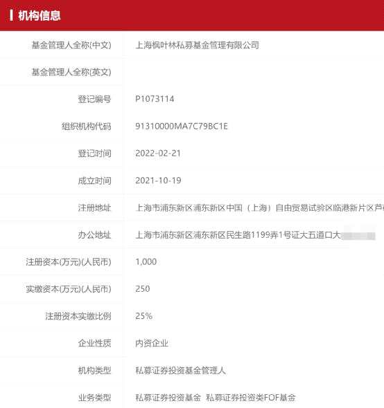 還有一家“上海楓葉林私募基金管理有限公司”,也在2月21日完成私募證券投資基金管理人備案登記,該公司成立于2021年10月19日,注冊資本1000萬元,實繳資本250萬元,注冊和辦公地均在上海浦東新區(qū)。