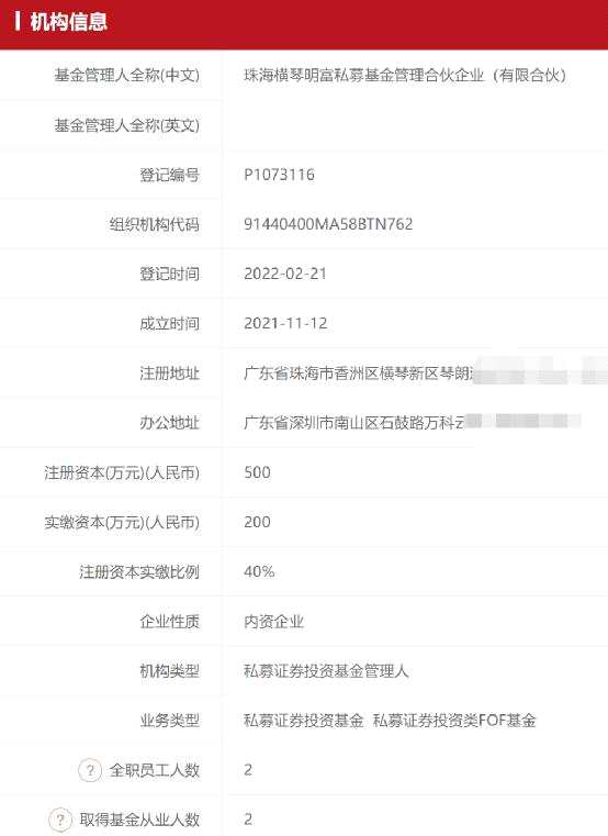 同樣是在2月21日,珠海橫琴明富私募基金管理合伙企業(yè)(有限合伙)也在基金業(yè)協(xié)會完成了備案登記,機構類型是私募證券投資基金管理人。該公司成立于2021年11月12日,注冊資本500萬元,實繳200萬元,注冊地在廣東珠海香洲區(qū),辦公地在廣州深圳南山區(qū)。