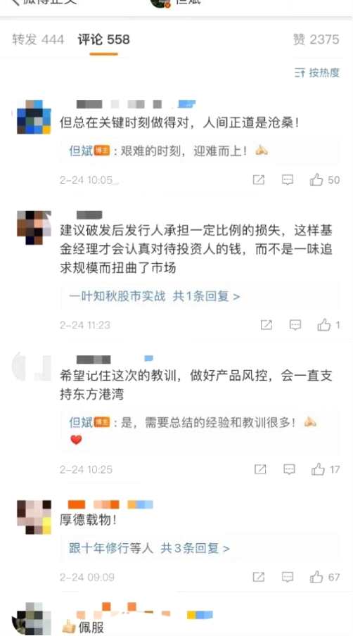 這一消息也引發(fā)市場的熱議。既有網(wǎng)友點贊這一行為,也有網(wǎng)友提出建議,希望產(chǎn)品破發(fā)后發(fā)行人承擔(dān)一定比例的虧損,扭轉(zhuǎn)行業(yè)盲目追求規(guī)模擴張的亂象。也有網(wǎng)友提及,東方港灣應(yīng)記住教訓(xùn),做好產(chǎn)品風(fēng)控。