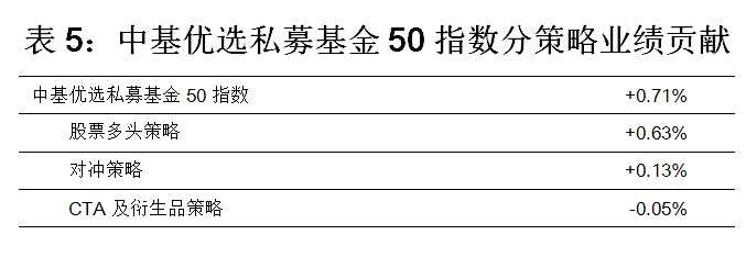 上周,中基50指數(shù)上漲0.71%,三大類策略中股票多頭策略貢獻(xiàn)最多,為0.63%,對沖策略也有貢獻(xiàn),達(dá)0.13%,CTA及衍生品策略微虧0.05%。