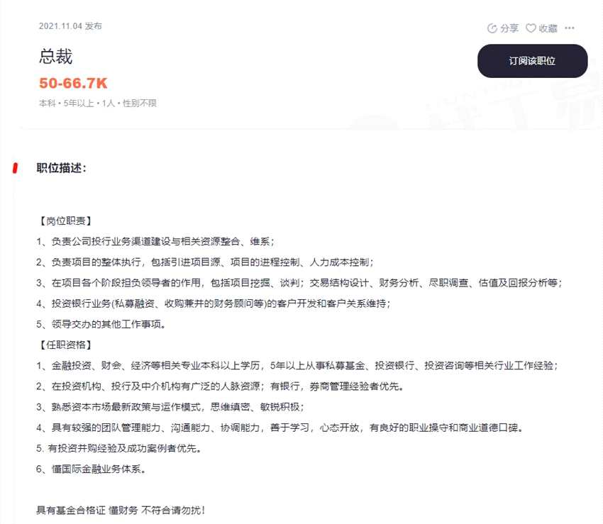 實(shí)際上,通過(guò)公開方式招聘高管的情況在業(yè)內(nèi)較少發(fā)生。一位私募人士表示:“私募CEO一般是創(chuàng)始人本人,或創(chuàng)始合伙人,以及與創(chuàng)始人有過(guò)長(zhǎng)期合作關(guān)系的市場(chǎng)人士,幾乎不會(huì)對(duì)外招募,即使內(nèi)部選拔也一般只會(huì)給到副總經(jīng)理職位?!?/p>