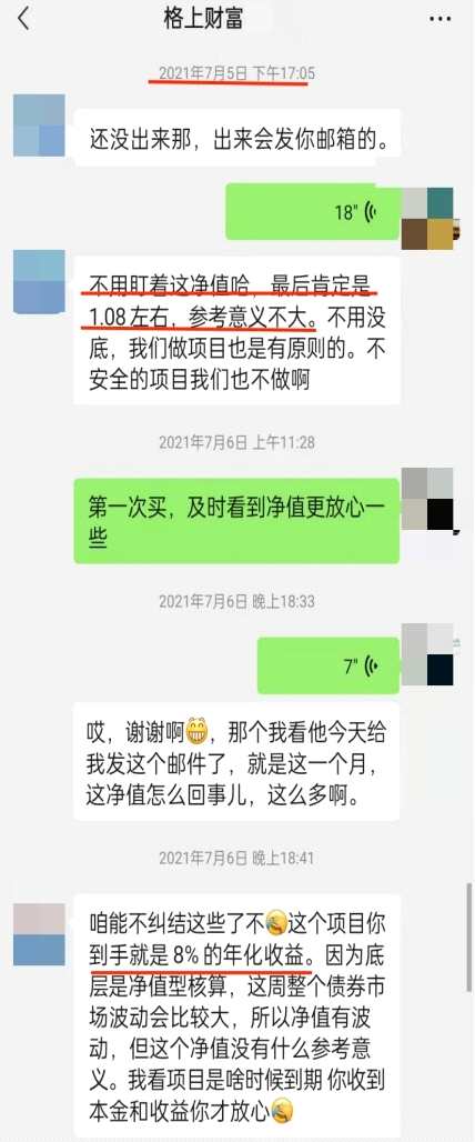 據(jù)孫先生提供的與金樟金澤11號銷售人員的微信聊天截圖,在2021年5月22日,銷售人員用語音向其介紹:“8%不是浮動的,是到您手里的一個純收益,就是說多少就是多少,按照您的實(shí)際存續(xù)天數(shù)給您的?!?021年5月25日的電話錄音中,該銷售也提到“到期了之后,肯定您持有多少天,就是按照合同約定的8%的年化收益給到您,一分錢都不會差的”“如果說有什么的,不夠的話,我們會補(bǔ)給你?!?/strong>