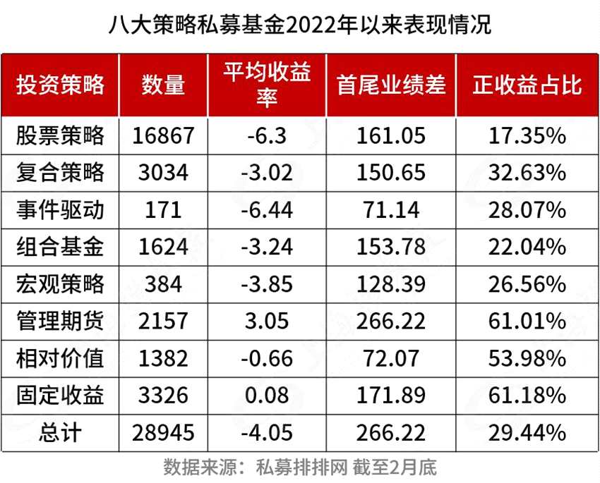 摘要: 萬綠叢中一點紅。私募排排網最新數(shù)據(jù)顯示,截至2月底,今年以來私募平均跌幅為4.05%,實現(xiàn)正收益的基金占比不到三成。CTA策略以3.05%的平均正收益奪得同期業(yè)績冠軍,