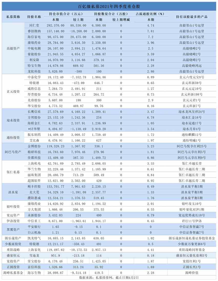 從數(shù)據(jù)來看,其中百億級(jí)私募新進(jìn)上市公司38家,減持上市公司9家,增持上市公司8家,持有42家上市公司股份不變。截至4月2日數(shù)據(jù),百億級(jí)私募在2021年末持股市值較大的個(gè)股主要有貴州茅臺(tái)(600519)121.55億元、紫金礦業(yè)(601899)91.27億元、同仁堂(600085)29.24億元、東方財(cái)富(300059)19.06億元、睿創(chuàng)微納15.71億元、華潤(rùn)三九(000999)14.38億元、金博股份11.93億元、贛鋒鋰業(yè)(002460)10.22億元等。2021年第四季度百億級(jí)私募新進(jìn)個(gè)股中,持股市值居前的主要有萬華化學(xué)(600309)、廣電計(jì)量(002967)、福萊特(601865)、新潔能(605111)、涪陵榨菜(002507)、【中航重機(jī)(600765)、股吧】(600765)等。目前出現(xiàn)在A股前十大流通股東名單中次數(shù)較多的百億級(jí)私募主要有高毅資產(chǎn)、迎水投資、玄元投資等。