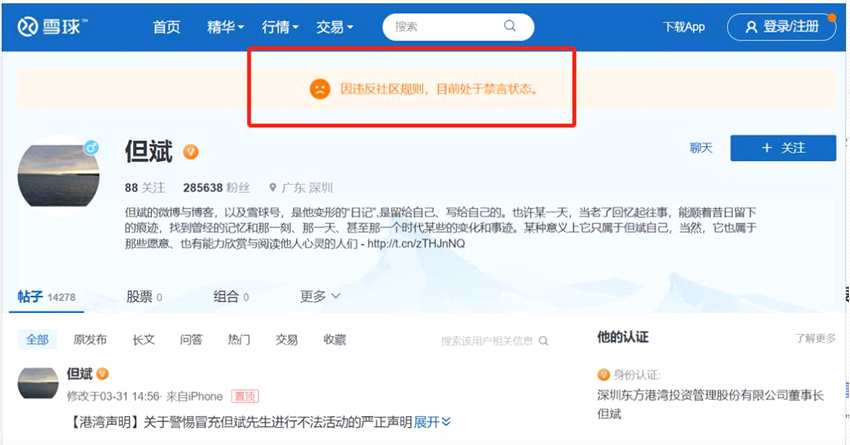 4月6日,深圳東方港灣投資董事長但斌的微博顯示“因違反相關(guān)法律法規(guī),該用戶目前處于禁言狀態(tài)”。截至目前,但斌最后一條微博停留在4月5日晚。晚間最新消息顯示,但斌雪球賬號也被禁言?!耙蜻`反社區(qū)規(guī)則,目前處于禁言狀態(tài)?!?/p>