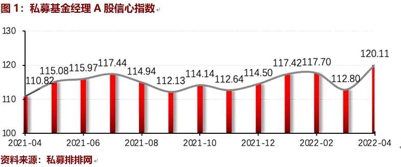 在3月中旬以來A股市場整體觸底回升的背景下,當(dāng)前私募業(yè)對于A股的整體投資信心明顯好轉(zhuǎn)。前述第三方機(jī)構(gòu)公布的私募基金經(jīng)理4月A股投資信心指數(shù)月報顯示,截至4月初,私募基金經(jīng)理A股信心指數(shù)為120.11點(diǎn),較前一月大幅上漲7.31點(diǎn),在上月短暫下滑后一舉創(chuàng)出近一年以來的新高。