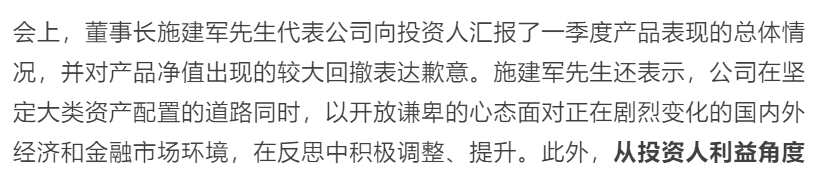 “今年以來,市場大幅調(diào)整,產(chǎn)品短期凈值回撤和波動較大,給投資人帶來不好的持有體驗……”面對有“很大意見”的投資人,這一次擔(dān)負(fù)溝通重任的也換成了公司董事長施建軍。