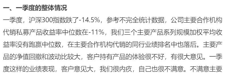 會上,施建軍匯報了一季度產(chǎn)品表現(xiàn)的總體情況——主要合作機構(gòu)代銷私募產(chǎn)品收益率中位數(shù)在-11%?!斑@樣的業(yè)績表現(xiàn),客戶意見大,我們很內(nèi)疚,自己也很不滿意?!笔┙ㄜ姺Q。