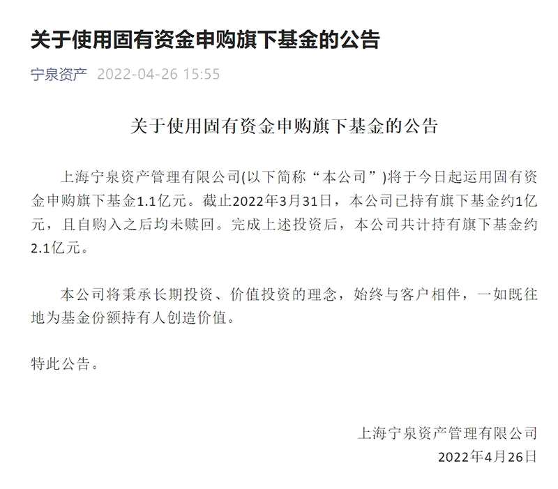 4月26日下午,寧泉資產(chǎn)發(fā)布公告稱,公司將于當日起運用固有資金申購旗下基金1.1億元。完成上述投資后,公司共計持有旗下基金約2.1億元。