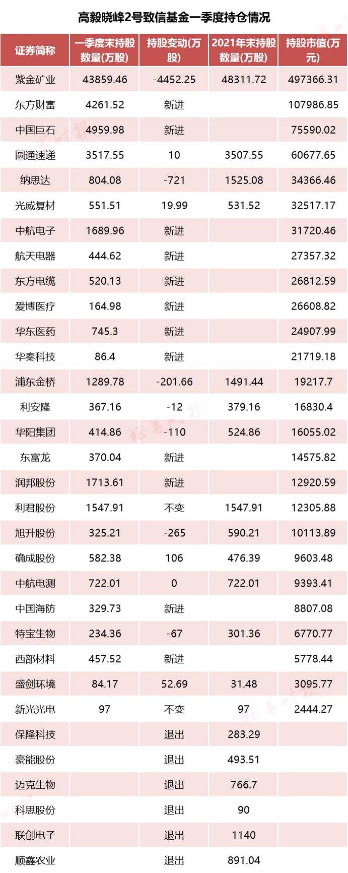 減持方面,鄧曉峰一季度對其重倉持有的紫金礦業(yè)(601899)進行了減持,高毅曉峰2號致信基金減持紫金礦業(yè)4452.25萬股,但減持后,紫金礦業(yè)仍是高毅曉峰2號致信基金的頭號重倉股,期末持股市值仍有4.39億股,持倉市值達49.74億元。此外,聯(lián)創(chuàng)電子(002036)、邁克生物(300463)、豪能股份(603809)、保隆科技(603197)等公布的數(shù)據(jù)顯示,高毅曉峰2號致信基金退出了公司前十大股東。