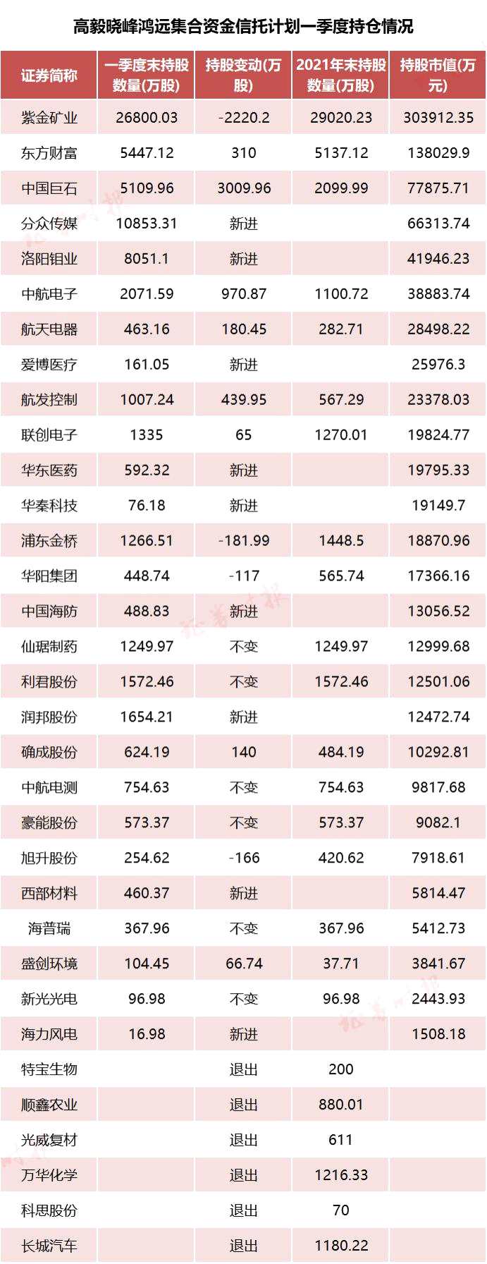 鄧曉峰管理的另一只規(guī)模較大的基金——高毅曉峰鴻遠集合資金信托計劃,今年一季度持倉也發(fā)了較大變化。