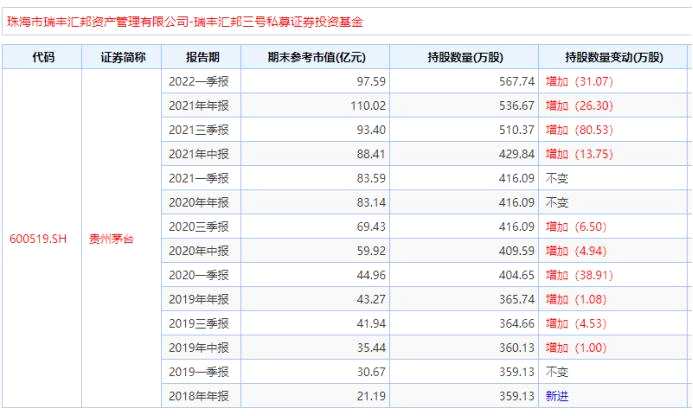 瑞豐匯邦也是重倉持有貴州茅臺的私募機構,早在2018年底,瑞豐匯邦三號私募證券投資基金便新晉成為貴州茅臺前十大股東,隨后,該基金陸續(xù)增持,持倉市值在2021年底突破100億元,達110.02億元。今年一季度,瑞豐匯邦又出手增持了茅臺,增持股數(shù)達31.07萬股,持股數(shù)增至567.74萬股。