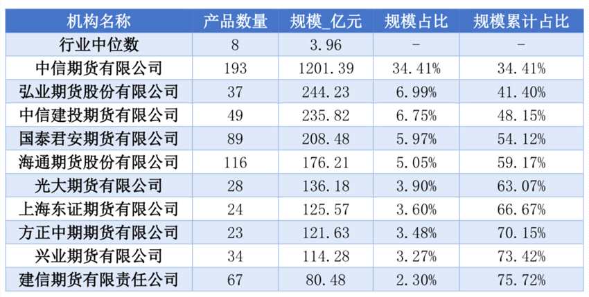 值得注意的是,期貨公司資管業(yè)務行業(yè)內(nèi)部的分化還在逐步拉大。根據(jù)中期協(xié)統(tǒng)計的截至3月底期貨公司資管產(chǎn)品規(guī)模排名情況,行業(yè)的管理規(guī)模中位數(shù)為3.96億元。但排名第一的期貨公司——中信期貨資管業(yè)務規(guī)模已經(jīng)超過1200億元,占到行業(yè)管理規(guī)模的34.41%,較2月底增加64.17億元。而排名前十的期貨公司資管業(yè)務規(guī)模合計,已經(jīng)占到全行業(yè)管理規(guī)模的75.72%,相比2021年年底的75.34%,增長了0.38個百分點。